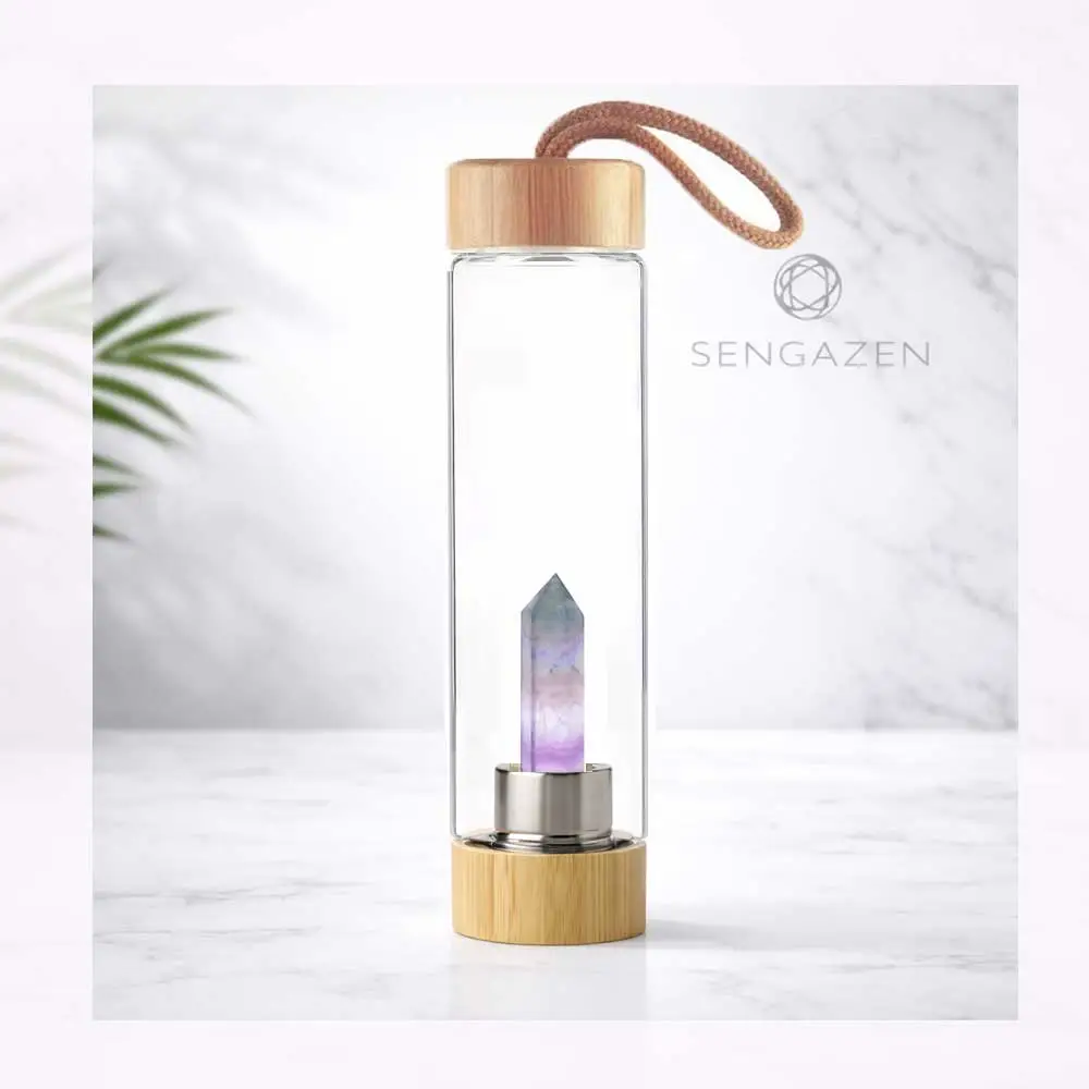 Crafted from premium borosilicate glass with a natural bamboo lid, each bottle features a unique crystal designed to bring balance, clarity, and intention into your daily routine.