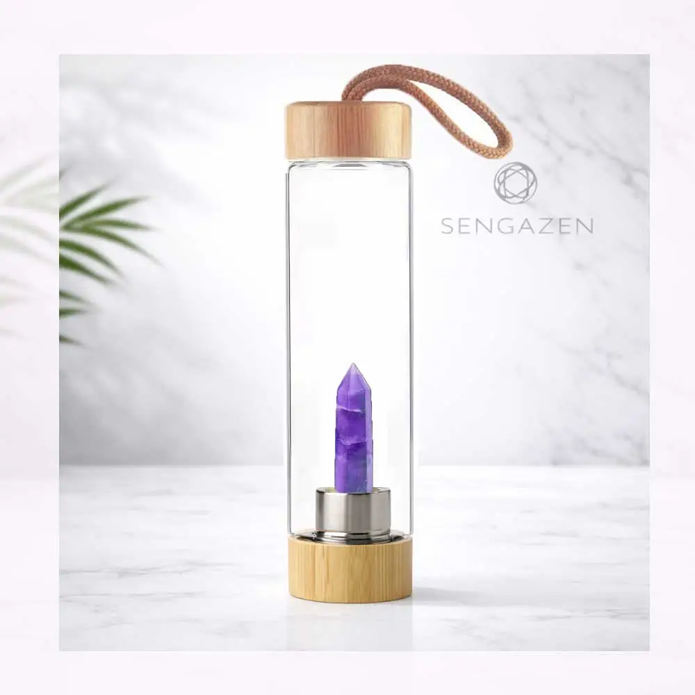 Crafted from premium borosilicate glass with a natural bamboo lid, each bottle features a unique crystal designed to bring balance, clarity, and intention into your daily routine.